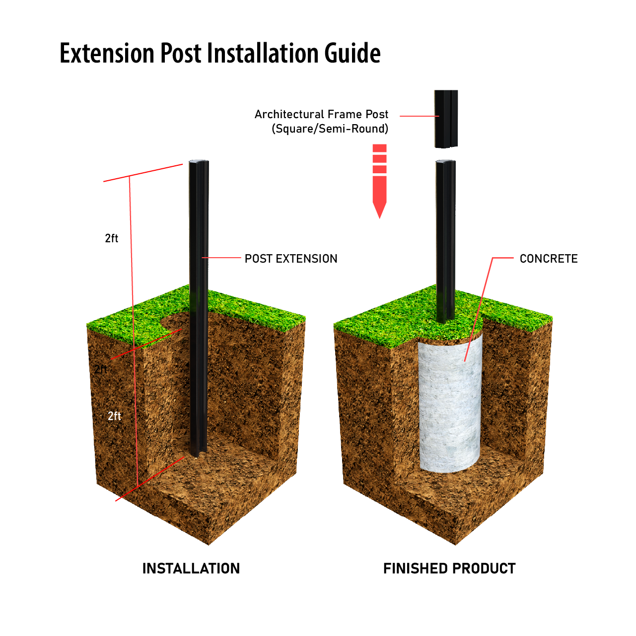 Looking for 10' Posts with Ground Shipping Instead of Freight? Select the 10' (8' Post + 2' Post Extensions) from the post length options. Our Architectural aluminum post extensions are compatible with Square and Semi-round Architectural aluminum posts. They allow aluminum posts to stand 8' above the ground by installing 2ft into the ground (with cement) and 2ft into the post. Sold as a set of 2.